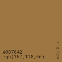 Цвет #9D7642 в цветовой модели RGB обозначается тремя октетами (157, 118, 66) в десятичном формате и #9D7642 в шестнадцатиричном (hex) формате, которые являются интенсивностью красного 157 (hex 9D), интенсивность зелёного 118 (hex 76) и интенсивность синего 66 (hex 42).