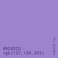 Цвет #9D82CD в цветовой модели RGB обозначается тремя октетами (157, 130, 205) в десятичном формате и #9D82CD в шестнадцатиричном (hex) формате, которые являются интенсивностью красного 157 (hex 9D), интенсивность зелёного 130 (hex 82) и интенсивность синего 205 (hex CD).