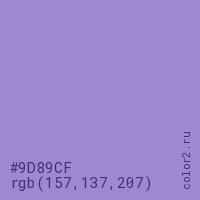 Цвет #9D89CF в цветовой модели RGB обозначается тремя октетами (157, 137, 207) в десятичном формате и #9D89CF в шестнадцатиричном (hex) формате, которые являются интенсивностью красного 157 (hex 9D), интенсивность зелёного 137 (hex 89) и интенсивность синего 207 (hex CF).