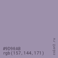 Цвет #9D90AB в цветовой модели RGB обозначается тремя октетами (157, 144, 171) в десятичном формате и #9D90AB в шестнадцатиричном (hex) формате, которые являются интенсивностью красного 157 (hex 9D), интенсивность зелёного 144 (hex 90) и интенсивность синего 171 (hex AB).