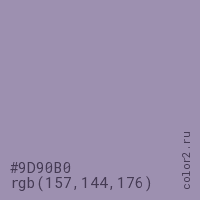 Цвет #9D90B0 в цветовой модели RGB обозначается тремя октетами (157, 144, 176) в десятичном формате и #9D90B0 в шестнадцатиричном (hex) формате, которые являются интенсивностью красного 157 (hex 9D), интенсивность зелёного 144 (hex 90) и интенсивность синего 176 (hex B0).