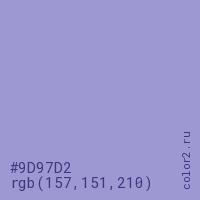 Цвет #9D97D2 в цветовой модели RGB обозначается тремя октетами (157, 151, 210) в десятичном формате и #9D97D2 в шестнадцатиричном (hex) формате, которые являются интенсивностью красного 157 (hex 9D), интенсивность зелёного 151 (hex 97) и интенсивность синего 210 (hex D2).