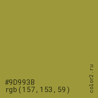 Цвет #9D993B в цветовой модели RGB обозначается тремя октетами (157, 153, 59) в десятичном формате и #9D993B в шестнадцатиричном (hex) формате, которые являются интенсивностью красного 157 (hex 9D), интенсивность зелёного 153 (hex 99) и интенсивность синего 59 (hex 3B).