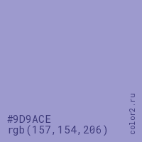 Цвет #9D9ACE в цветовой модели RGB обозначается тремя октетами (157, 154, 206) в десятичном формате и #9D9ACE в шестнадцатиричном (hex) формате, которые являются интенсивностью красного 157 (hex 9D), интенсивность зелёного 154 (hex 9A) и интенсивность синего 206 (hex CE).