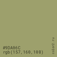 Цвет #9DA06C в цветовой модели RGB обозначается тремя октетами (157, 160, 108) в десятичном формате и #9DA06C в шестнадцатиричном (hex) формате, которые являются интенсивностью красного 157 (hex 9D), интенсивность зелёного 160 (hex A0) и интенсивность синего 108 (hex 6C).