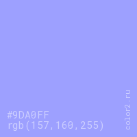 Цвет #9DA0FF в цветовой модели RGB обозначается тремя октетами (157, 160, 255) в десятичном формате и #9DA0FF в шестнадцатиричном (hex) формате, которые являются интенсивностью красного 157 (hex 9D), интенсивность зелёного 160 (hex A0) и интенсивность синего 255 (hex FF).