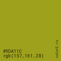Цвет #9DA11C в цветовой модели RGB обозначается тремя октетами (157, 161, 28) в десятичном формате и #9DA11C в шестнадцатиричном (hex) формате, которые являются интенсивностью красного 157 (hex 9D), интенсивность зелёного 161 (hex A1) и интенсивность синего 28 (hex 1C).