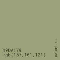 Цвет #9DA179 в цветовой модели RGB обозначается тремя октетами (157, 161, 121) в десятичном формате и #9DA179 в шестнадцатиричном (hex) формате, которые являются интенсивностью красного 157 (hex 9D), интенсивность зелёного 161 (hex A1) и интенсивность синего 121 (hex 79).