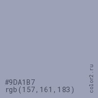 Цвет #9DA1B7 в цветовой модели RGB обозначается тремя октетами (157, 161, 183) в десятичном формате и #9DA1B7 в шестнадцатиричном (hex) формате, которые являются интенсивностью красного 157 (hex 9D), интенсивность зелёного 161 (hex A1) и интенсивность синего 183 (hex B7).
