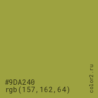Цвет #9DA240 в цветовой модели RGB обозначается тремя октетами (157, 162, 64) в десятичном формате и #9DA240 в шестнадцатиричном (hex) формате, которые являются интенсивностью красного 157 (hex 9D), интенсивность зелёного 162 (hex A2) и интенсивность синего 64 (hex 40).