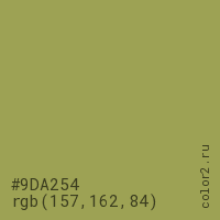 Цвет #9DA254 в цветовой модели RGB обозначается тремя октетами (157, 162, 84) в десятичном формате и #9DA254 в шестнадцатиричном (hex) формате, которые являются интенсивностью красного 157 (hex 9D), интенсивность зелёного 162 (hex A2) и интенсивность синего 84 (hex 54).