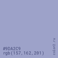 Цвет #9DA2C9 в цветовой модели RGB обозначается тремя октетами (157, 162, 201) в десятичном формате и #9DA2C9 в шестнадцатиричном (hex) формате, которые являются интенсивностью красного 157 (hex 9D), интенсивность зелёного 162 (hex A2) и интенсивность синего 201 (hex C9).