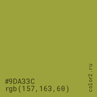 Цвет #9DA33C в цветовой модели RGB обозначается тремя октетами (157, 163, 60) в десятичном формате и #9DA33C в шестнадцатиричном (hex) формате, которые являются интенсивностью красного 157 (hex 9D), интенсивность зелёного 163 (hex A3) и интенсивность синего 60 (hex 3C).