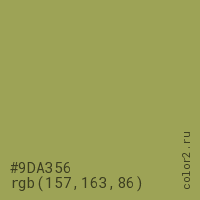 Цвет #9DA356 в цветовой модели RGB обозначается тремя октетами (157, 163, 86) в десятичном формате и #9DA356 в шестнадцатиричном (hex) формате, которые являются интенсивностью красного 157 (hex 9D), интенсивность зелёного 163 (hex A3) и интенсивность синего 86 (hex 56).