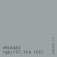 Цвет #9DA4A3 в цветовой модели RGB обозначается тремя октетами (157, 164, 163) в десятичном формате и #9DA4A3 в шестнадцатиричном (hex) формате, которые являются интенсивностью красного 157 (hex 9D), интенсивность зелёного 164 (hex A4) и интенсивность синего 163 (hex A3).