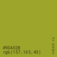 Цвет #9DA52B в цветовой модели RGB обозначается тремя октетами (157, 165, 43) в десятичном формате и #9DA52B в шестнадцатиричном (hex) формате, которые являются интенсивностью красного 157 (hex 9D), интенсивность зелёного 165 (hex A5) и интенсивность синего 43 (hex 2B).