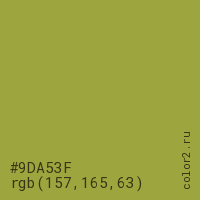 Цвет #9DA53F в цветовой модели RGB обозначается тремя октетами (157, 165, 63) в десятичном формате и #9DA53F в шестнадцатиричном (hex) формате, которые являются интенсивностью красного 157 (hex 9D), интенсивность зелёного 165 (hex A5) и интенсивность синего 63 (hex 3F).
