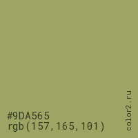 Цвет #9DA565 в цветовой модели RGB обозначается тремя октетами (157, 165, 101) в десятичном формате и #9DA565 в шестнадцатиричном (hex) формате, которые являются интенсивностью красного 157 (hex 9D), интенсивность зелёного 165 (hex A5) и интенсивность синего 101 (hex 65).