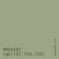 Цвет #9DA587 в цветовой модели RGB обозначается тремя октетами (157, 165, 135) в десятичном формате и #9DA587 в шестнадцатиричном (hex) формате, которые являются интенсивностью красного 157 (hex 9D), интенсивность зелёного 165 (hex A5) и интенсивность синего 135 (hex 87).