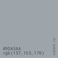 Цвет #9DA5AA в цветовой модели RGB обозначается тремя октетами (157, 165, 170) в десятичном формате и #9DA5AA в шестнадцатиричном (hex) формате, которые являются интенсивностью красного 157 (hex 9D), интенсивность зелёного 165 (hex A5) и интенсивность синего 170 (hex AA).