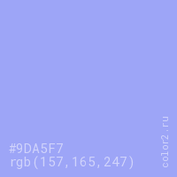Цвет #9DA5F7 в цветовой модели RGB обозначается тремя октетами (157, 165, 247) в десятичном формате и #9DA5F7 в шестнадцатиричном (hex) формате, которые являются интенсивностью красного 157 (hex 9D), интенсивность зелёного 165 (hex A5) и интенсивность синего 247 (hex F7).