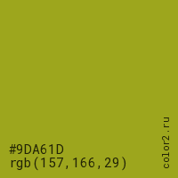 Цвет #9DA61D в цветовой модели RGB обозначается тремя октетами (157, 166, 29) в десятичном формате и #9DA61D в шестнадцатиричном (hex) формате, которые являются интенсивностью красного 157 (hex 9D), интенсивность зелёного 166 (hex A6) и интенсивность синего 29 (hex 1D).