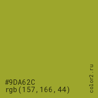 Цвет #9DA62C в цветовой модели RGB обозначается тремя октетами (157, 166, 44) в десятичном формате и #9DA62C в шестнадцатиричном (hex) формате, которые являются интенсивностью красного 157 (hex 9D), интенсивность зелёного 166 (hex A6) и интенсивность синего 44 (hex 2C).