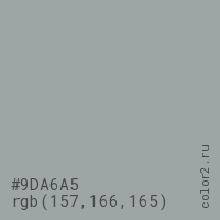 Цвет #9DA6A5 в цветовой модели RGB обозначается тремя октетами (157, 166, 165) в десятичном формате и #9DA6A5 в шестнадцатиричном (hex) формате, которые являются интенсивностью красного 157 (hex 9D), интенсивность зелёного 166 (hex A6) и интенсивность синего 165 (hex A5).