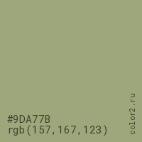 Цвет #9DA77B в цветовой модели RGB обозначается тремя октетами (157, 167, 123) в десятичном формате и #9DA77B в шестнадцатиричном (hex) формате, которые являются интенсивностью красного 157 (hex 9D), интенсивность зелёного 167 (hex A7) и интенсивность синего 123 (hex 7B).