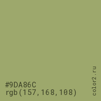 Цвет #9DA86C в цветовой модели RGB обозначается тремя октетами (157, 168, 108) в десятичном формате и #9DA86C в шестнадцатиричном (hex) формате, которые являются интенсивностью красного 157 (hex 9D), интенсивность зелёного 168 (hex A8) и интенсивность синего 108 (hex 6C).