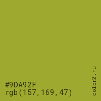 Цвет #9DA92F в цветовой модели RGB обозначается тремя октетами (157, 169, 47) в десятичном формате и #9DA92F в шестнадцатиричном (hex) формате, которые являются интенсивностью красного 157 (hex 9D), интенсивность зелёного 169 (hex A9) и интенсивность синего 47 (hex 2F).
