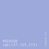Цвет #9DA9DB в цветовой модели RGB обозначается тремя октетами (157, 169, 219) в десятичном формате и #9DA9DB в шестнадцатиричном (hex) формате, которые являются интенсивностью красного 157 (hex 9D), интенсивность зелёного 169 (hex A9) и интенсивность синего 219 (hex DB).