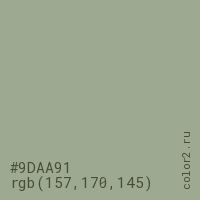 Цвет #9DAA91 в цветовой модели RGB обозначается тремя октетами (157, 170, 145) в десятичном формате и #9DAA91 в шестнадцатиричном (hex) формате, которые являются интенсивностью красного 157 (hex 9D), интенсивность зелёного 170 (hex AA) и интенсивность синего 145 (hex 91).