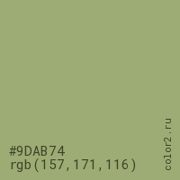 Цвет #9DAB74 в цветовой модели RGB обозначается тремя октетами (157, 171, 116) в десятичном формате и #9DAB74 в шестнадцатиричном (hex) формате, которые являются интенсивностью красного 157 (hex 9D), интенсивность зелёного 171 (hex AB) и интенсивность синего 116 (hex 74).