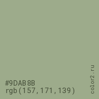 Цвет #9DAB8B в цветовой модели RGB обозначается тремя октетами (157, 171, 139) в десятичном формате и #9DAB8B в шестнадцатиричном (hex) формате, которые являются интенсивностью красного 157 (hex 9D), интенсивность зелёного 171 (hex AB) и интенсивность синего 139 (hex 8B).