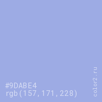 Цвет #9DABE4 в цветовой модели RGB обозначается тремя октетами (157, 171, 228) в десятичном формате и #9DABE4 в шестнадцатиричном (hex) формате, которые являются интенсивностью красного 157 (hex 9D), интенсивность зелёного 171 (hex AB) и интенсивность синего 228 (hex E4).