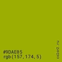 Цвет #9DAE05 в цветовой модели RGB обозначается тремя октетами (157, 174, 5) в десятичном формате и #9DAE05 в шестнадцатиричном (hex) формате, которые являются интенсивностью красного 157 (hex 9D), интенсивность зелёного 174 (hex AE) и интенсивность синего 5 (hex 05).