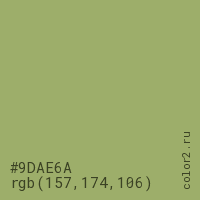 Цвет #9DAE6A в цветовой модели RGB обозначается тремя октетами (157, 174, 106) в десятичном формате и #9DAE6A в шестнадцатиричном (hex) формате, которые являются интенсивностью красного 157 (hex 9D), интенсивность зелёного 174 (hex AE) и интенсивность синего 106 (hex 6A).