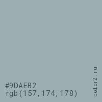 Цвет #9DAEB2 в цветовой модели RGB обозначается тремя октетами (157, 174, 178) в десятичном формате и #9DAEB2 в шестнадцатиричном (hex) формате, которые являются интенсивностью красного 157 (hex 9D), интенсивность зелёного 174 (hex AE) и интенсивность синего 178 (hex B2).