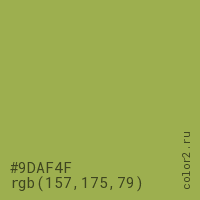 Цвет #9DAF4F в цветовой модели RGB обозначается тремя октетами (157, 175, 79) в десятичном формате и #9DAF4F в шестнадцатиричном (hex) формате, которые являются интенсивностью красного 157 (hex 9D), интенсивность зелёного 175 (hex AF) и интенсивность синего 79 (hex 4F).