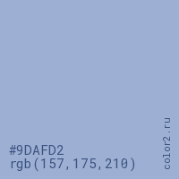 Цвет #9DAFD2 в цветовой модели RGB обозначается тремя октетами (157, 175, 210) в десятичном формате и #9DAFD2 в шестнадцатиричном (hex) формате, которые являются интенсивностью красного 157 (hex 9D), интенсивность зелёного 175 (hex AF) и интенсивность синего 210 (hex D2).