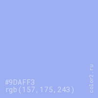 Цвет #9DAFF3 в цветовой модели RGB обозначается тремя октетами (157, 175, 243) в десятичном формате и #9DAFF3 в шестнадцатиричном (hex) формате, которые являются интенсивностью красного 157 (hex 9D), интенсивность зелёного 175 (hex AF) и интенсивность синего 243 (hex F3).