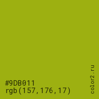 Цвет #9DB011 в цветовой модели RGB обозначается тремя октетами (157, 176, 17) в десятичном формате и #9DB011 в шестнадцатиричном (hex) формате, которые являются интенсивностью красного 157 (hex 9D), интенсивность зелёного 176 (hex B0) и интенсивность синего 17 (hex 11).