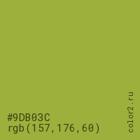Цвет #9DB03C в цветовой модели RGB обозначается тремя октетами (157, 176, 60) в десятичном формате и #9DB03C в шестнадцатиричном (hex) формате, которые являются интенсивностью красного 157 (hex 9D), интенсивность зелёного 176 (hex B0) и интенсивность синего 60 (hex 3C).