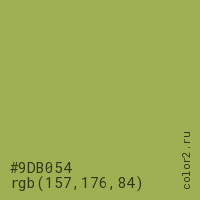 Цвет #9DB054 в цветовой модели RGB обозначается тремя октетами (157, 176, 84) в десятичном формате и #9DB054 в шестнадцатиричном (hex) формате, которые являются интенсивностью красного 157 (hex 9D), интенсивность зелёного 176 (hex B0) и интенсивность синего 84 (hex 54).