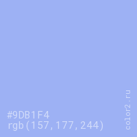 Цвет #9DB1F4 в цветовой модели RGB обозначается тремя октетами (157, 177, 244) в десятичном формате и #9DB1F4 в шестнадцатиричном (hex) формате, которые являются интенсивностью красного 157 (hex 9D), интенсивность зелёного 177 (hex B1) и интенсивность синего 244 (hex F4).
