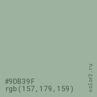 Цвет #9DB39F в цветовой модели RGB обозначается тремя октетами (157, 179, 159) в десятичном формате и #9DB39F в шестнадцатиричном (hex) формате, которые являются интенсивностью красного 157 (hex 9D), интенсивность зелёного 179 (hex B3) и интенсивность синего 159 (hex 9F).