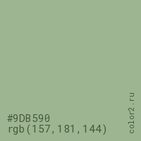Цвет #9DB590 в цветовой модели RGB обозначается тремя октетами (157, 181, 144) в десятичном формате и #9DB590 в шестнадцатиричном (hex) формате, которые являются интенсивностью красного 157 (hex 9D), интенсивность зелёного 181 (hex B5) и интенсивность синего 144 (hex 90).