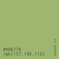 Цвет #9DB770 в цветовой модели RGB обозначается тремя октетами (157, 183, 112) в десятичном формате и #9DB770 в шестнадцатиричном (hex) формате, которые являются интенсивностью красного 157 (hex 9D), интенсивность зелёного 183 (hex B7) и интенсивность синего 112 (hex 70).