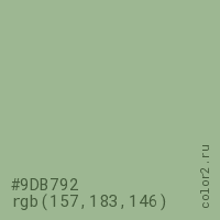 Цвет #9DB792 в цветовой модели RGB обозначается тремя октетами (157, 183, 146) в десятичном формате и #9DB792 в шестнадцатиричном (hex) формате, которые являются интенсивностью красного 157 (hex 9D), интенсивность зелёного 183 (hex B7) и интенсивность синего 146 (hex 92).